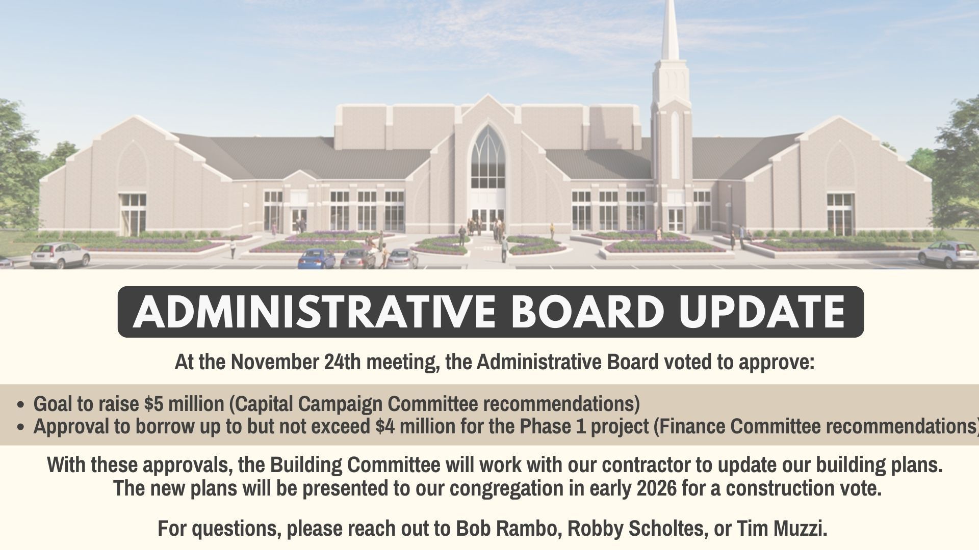 The Building Committee, made up of members with extensive experience in construction and a deep understanding of our church’s needs, has been prayerfully appointed to guide the building process. In the spirit of transparency and collaboration, the committee hosted a series of town hall meetings and collected feedback through a detailed congregational survey. The congregation's voices helped shape the vision for the future facility, and your continued input is welcome as we journey forward.
