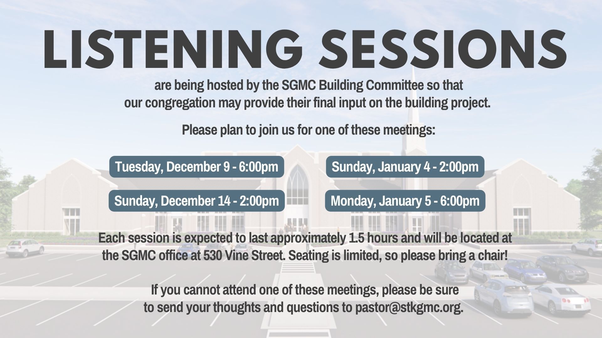 SGMC will host a church conference for the Finance Committee to discuss the church’s financial capabilities to complete this project. The church will vote on the building plans.